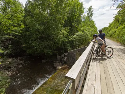 The Oro-Medonte Rail Trail is a year-round multi-use recreational trail on the former rail line linking the cities of Barrie and Orillia. Cyclists can explore nature, discover historical plaques, and stop at great local restaurants and shops for food, snacks, beverages and handmade products.