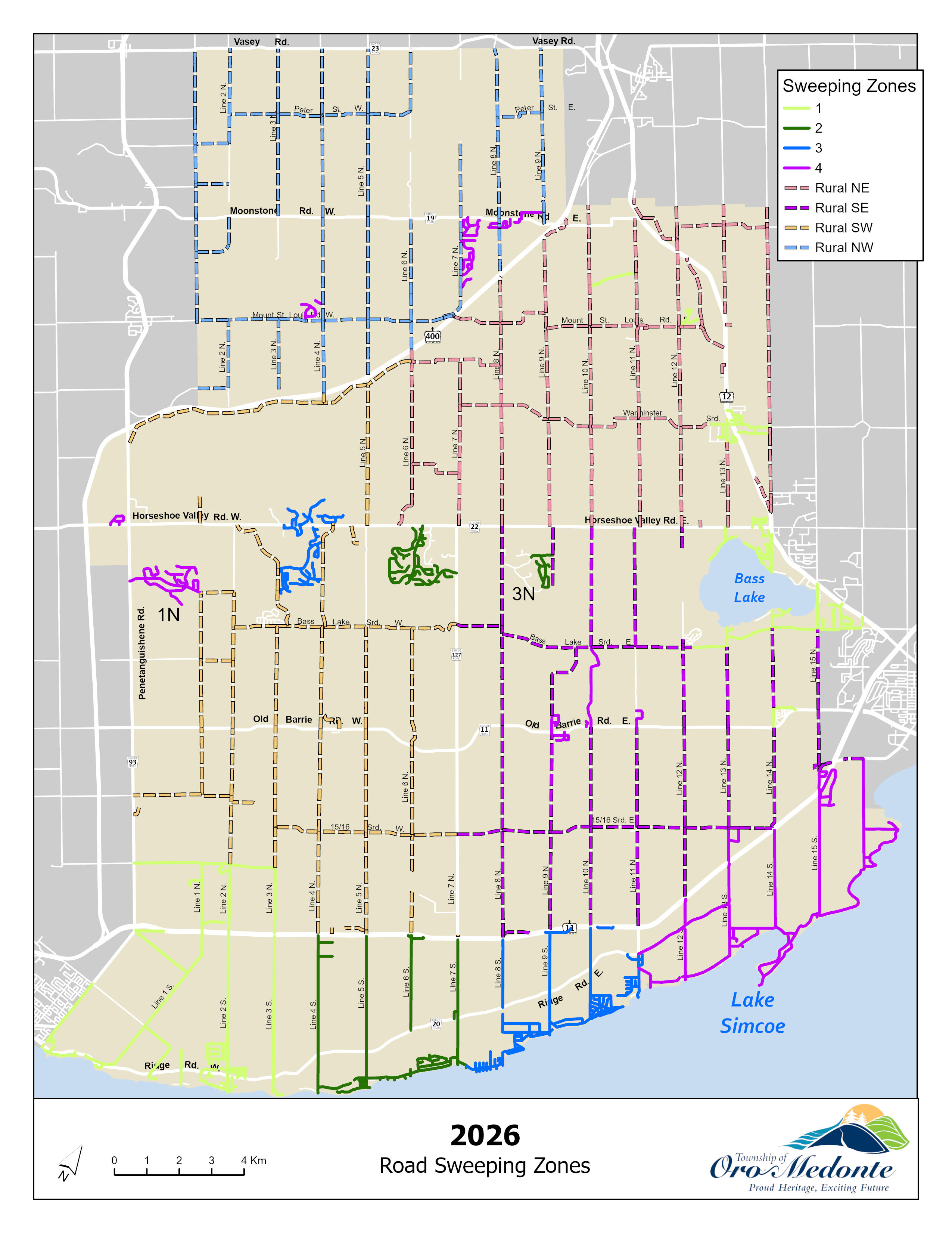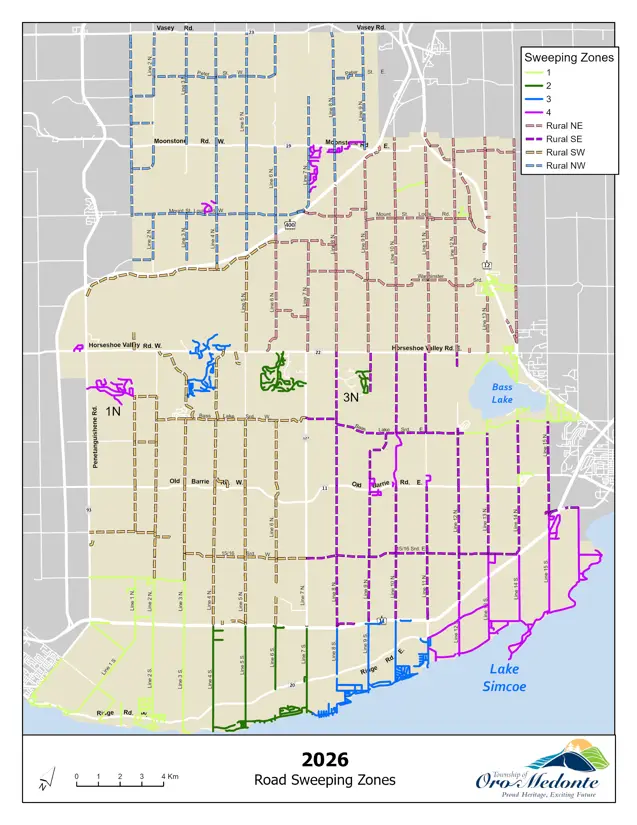 The street sweeping program starts in a different area of the Township each year to ensure that streets in any one area are not always swept last. This year, the program will commence on May 4, 2026, in Warminister, Prices Corners (North Zone 1), and Shanty Bay, Barrie Corner (South Zone 1), then proceed to Zones 2, followed by Zones 3 and 4, with rural zones completed after the residential areas. Progress updates are available on the Township's website and social media channels.